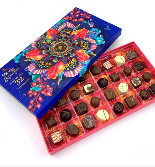 - Gorgeous Gift: Over 30 award-winning chocolate truffles across three delicious flavours Choccy Scoffy, Flutter Scotch, and Scrumple Nutty beautifully packaged in elegant gift boxes with whimsical Monty Bojangles artwork.